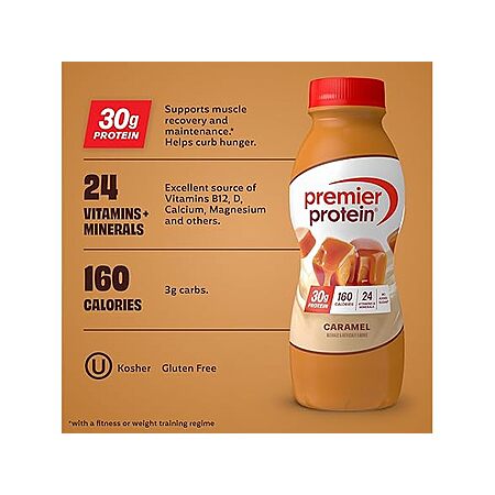 $23.99*:Premier Protein Shake, Caramel, 30g Protein, No Added Sugar, 24 Vitamins & Minerals to Support Immune Health, 11.5 fl oz, 12 Pack