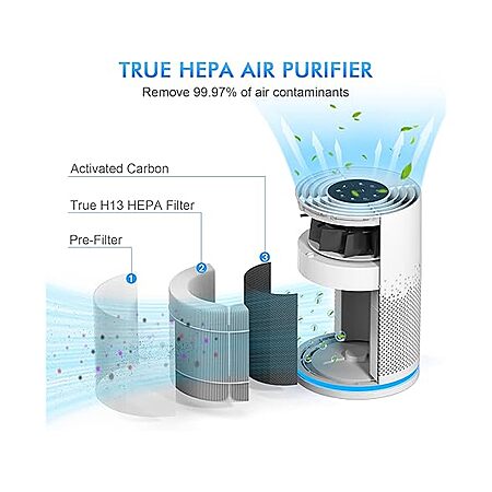 - 【H13 HEPA FILTER】H13 true Hepa filter with three filtration layers: pre-filter, true HEPA, activated carbon to capture 99.97% of airborne particles, Perfect for quickly cleaning a wide range of contaminants including dust, pollen, pet dander, cooking's smoke odors in a certain space