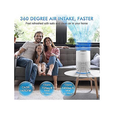 - 【EFFICIENT AIR PURIFIER】The compact frame and 360°air intake design help you efficient purify the air. Featuring a high CADR of 147CFM, this air cleaner purifies refreshes the air 5x per hour in rooms as large as 323 sq.ft ; In automatic mode, a smart sensor monitors air quality for you and adjusts to increase power if polluted air is detected