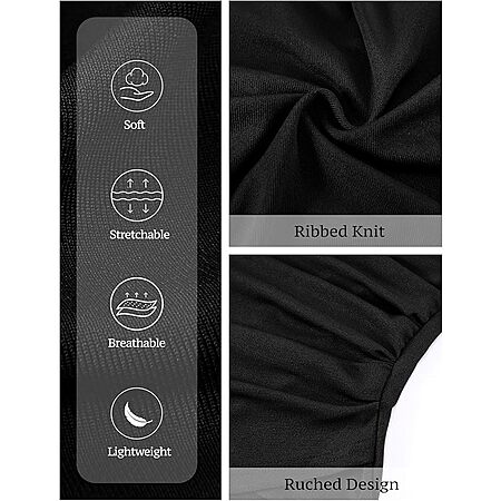 • Wrap + ruched waist design intended to offer a flattering silhouette
