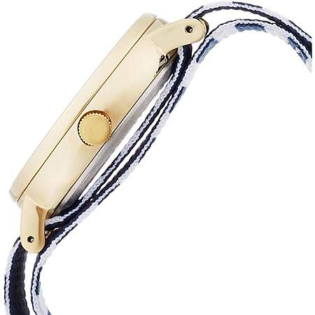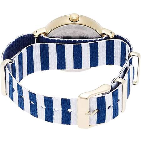 Timex TW2P91900 is fitted with a blue and white striped double layer nylon strap. Securing the strap is a pin buckle clasp made in stainless steel. The dial is white and it features tasteful sized, index hour markers and gold tone luminous stick shaped hands for exceptional readability.