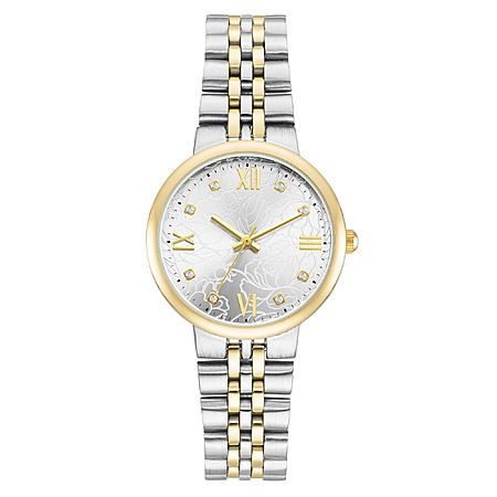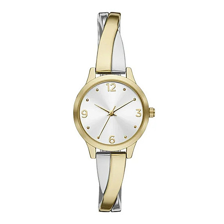 Time & Tru Women's Wristwatch: Gold Round Case, Silver Sunray Dial, Two Tone Half Bangle with Silver Link Bracelet (FMDOTT106)