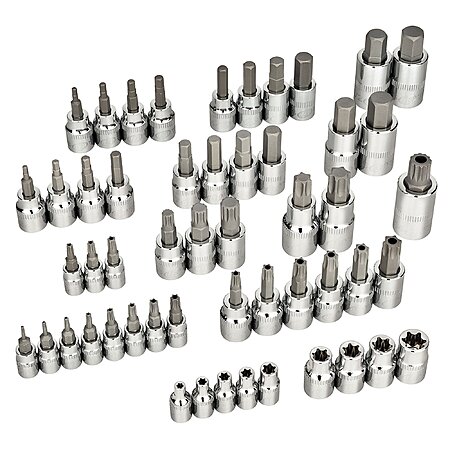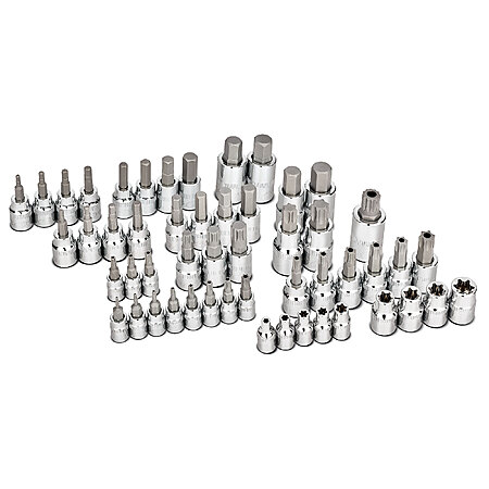 Includes: E-Torx bit sockets: 1/4 in. drive: E-4 thru E-8, 3/8 in. drive: E-10, E-11, E-12, E-14 | Tamper-proof Torx bit sockets: 1/4 in. drive: TT-7, TT-8, TT-10, TT-15, TT-20, TT-25, TT-27, TT-30, 3/8 in. drive: TT-30, TT-40, T-45, TT-47, TT-50, TT-55 | Torx bit sockets:1/2 in. drive: TT-55, TT-60 | Tamper-proof Torx Plus bit sockets: T-20, T-25, T-27 | Hex bit sockets: 3/8 in. drive SAE: 1/8, 5/32, 3/16, 7/32, 1/4, 5/16, 3/8, 7/17 in., 1/2 in. drive SAE: 1/2, 9/16 in., 3/8 in. drive metric: 3, 4, 5, 6, 7, 8, 9, 10mm, 1/2 in. drive metric: 12, 14mm | Triple Square XZN Bit Sockets: 3/8 in. drive: M-8, M-10, M-12, 1/2 in. drive: M-14