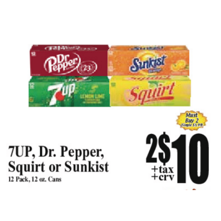 7up/DR Pepper/Sunkist/Squirt 2 for $10 + (CRV+Tax)