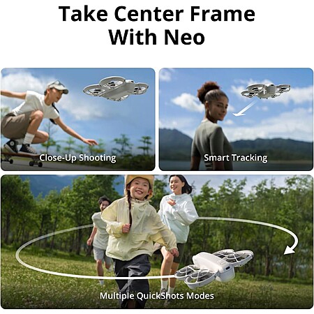 - AI Subject Tracking & QuickShots - Effortlessly capture stunning vlogs as Neo smartly follows you. Professional footage has never been easier with 8 creative QuickShots modes! | Palm Takeoff & Landing, Go Controller-Free - Neo takes off from your hand with just a push of a button. Neo's safe and easy operation makes it perfect for taking to family BBQs and hiking with friends. | Full-Coverage Propeller Guards - Dip and dive dynamically around your house and through tree branches without worry.