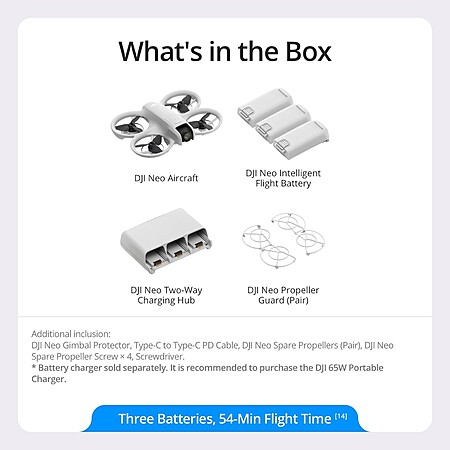 - DRONE INCLUDES: DJI Neo Drone Mini 4K UHD Video Quadcopter Aircraft CP.FP.00000218.02 | 3 Intelligent Flight Batteries | Two-Way Charging Hub | Propeller Guard (Pair) | Spare Propellers (Pair) | 4 Spare Propeller Screws | Screwdriver | DJI Neo Gimbal Protector | Type-C to Type-C PD Cable | DJI USA Authorized Warranty
