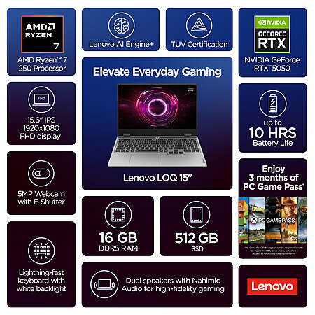| Product Description: | Discover gaming excellence with the Lenovo LOQ, designed for aspiring gamers wanting a new level of immersion. Driven by AMD Ryzen 7 processors and NVIDIA GeForce RTX 5050 graphics, it offers amazing visuals, courtesy of advanced ray tracing and AI-enhanced DLSS. Showcasing a modern Luna Grey design, it features Lenovo's AI Engine+, optimizing performance in real-time to suit varied activities. Keep your system cool and silent with Hyperchamber Cooling Technology, and engage in rapid gameplay on the responsive keyboard with soft-landing switches. This 15.6" display redefines gaming and streaming with superior resolution and refresh rates. Lenovo LOQ’s Hyperchamber Cooling keeps your system cool with turbo fans and copper heatpipes. Fn+Q lets you switch modes for gaming or studying. AI Engine+ ensures sustained cooling during heavy use. Step up to true gaming. Lenovo AI Engine+ makes gaming easy by optimizing your laptop’s performance automatically. Powered by the Lenovo AI Core, it tunes your CPU, GPU, and system settings for smoother gameplay and better FPS. With Scenario Detection, it adjusts in real time for gaming, streaming, or everyday tasks, ensuring reliable and hassle-free performance. The Lenovo LOQ keyboard is built to slay with a full layout, white lighting, and soft-landing switches for smooth, satisfying presses. Lenovo Spectrum adds 16 million color effects to match your vibe. Game, chat, flex—your way. Step into true gaming with the Lenovo LOQ display, perfect for gaming and watching your favorite streams. With FHD resolution and refresh rates starting at 144Hz, it’s twice as fast as standard screens. Offering 100% sRGB color accuracy, it’s ideal for coursework or casual gaming. NVIDIA G-Sync ensures smooth, tear-free frame rates, so you can enjoy every moment with clarity and speed. |