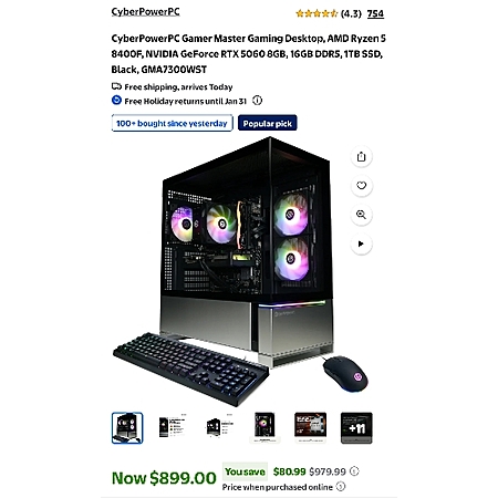 Model: CyberPowerPC Gamer Master Gaming Desktop, AMD Ryzen 5 8400F, NVIDIA GeForce RTX 5060 8GB, 16GB DDR5, 1TB SSD, Black, GMA7300WST