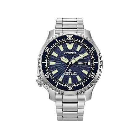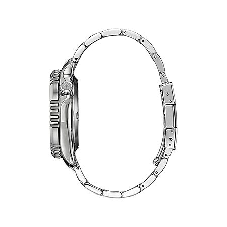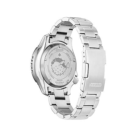 A classic never goes out of style. The newly reimagined Promaster Dive Automatic men's watch by Citizen goes deeper into the history of the original version of this diving watch that was released in 1989 for the new generation of dive watch enthusiasts. In silver-tone stainless steel, A design element that stands out is the distinctive, serrated bezel design that was inspired by a "Fugu," the Japanese name for pufferfish. Featuring a 3-piece, 44mm case, anti-reflective sapphire crystal, and a silver-tone stainless steel case and bracelet, the blue easy grip aluminum ring surrounds the blue dial and luminous hands and markers, while the case back features an engraving of a fugu or pufferfish. This technically advanced and stylish men's sport watch powered by the motion of your wrist comes in an exclusive collector's dive tank box and is ISO compliant with a screw-down crown and water resistant to 200 meters. Caliber 8204.