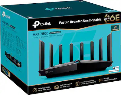 Embrace lightning-fast 7.8 Gbps speeds and experience 6GHz band with Archer AXE7800 Tri-Band WiFi 6E router. With eight WiFi streams combined with three separate bands, the Archer AXE95 achieves unbeatable performance to boost capacity and reduces congestion for smoother 8K streaming and AR/VR intensive gaming. Premium 2.5 Gbps and 1 Gbps WAN/LAN ports support flexibility for the peak performance, transmitting maximum fiber internet speeds to fill every corner of your house. Protect your IoT devices with TP-Link HomeShield.
