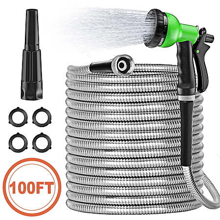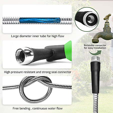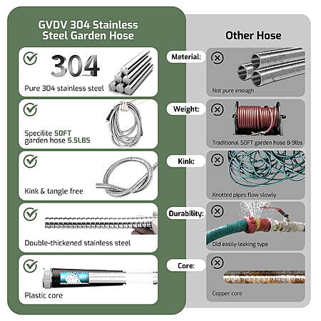 | Product Description: | GVDV robust METAL GARDEN HOSE boasts ultra-durable all-weather performance with its commercial-grade stainless steel and reinforced PVC construction, ensuring resistance to rust, corrosion, punctures, and extreme temperatures ranging from -40°F to 140°F. It’s designed to withstand thorny bushes, pet bites, and abrasive surfaces, and the high-density plastic inner tube can withstand up to 550 pounds of water pressure. Plus, its kink-free and tangle-free flexibility offered by the interlocking metal design guarantees seamless water flow in any situation, making it perfect for gardening, car washing, or yard cleaning without the frustration. Weighing just 9.9 lbs for the ample length of 100ft, it outperforms traditional rubber hoses by being 20-30% lighter and incredibly easy to store, making it ideal for RV trips, small sheds, or tight spaces. It comes equipped with versatile spray options, including an ergonomic 8 pattern nozzle for various tasks and a bonus 6-function straight-stream nozzle for precision cleaning. Its leak-proof, expandable design is enhanced with heavy-duty aluminum/copper connectors and includes four replaceable gaskets, ensuring a tight, leak-free seal and long-lasting reliability for any outdoor task or adventure. If you encounter any problems in the process of use, our professional customer service team will also be ready to provide you with perfect after-sales service. Durable Stainless Steel Exterior: The outer layer of the garden hose is made of stainless steel, which effectively prevents branches from puncturing the hose and can withstand pet chewing and wall corner abrasion. It is rust-free, lightweight, and versatile for different environments. Multi-Function Nozzles Included: The hose comes with a ergonomic 8-pattern nozzle adjusts sprays for gardens, cars, pets, or patios. Plus, a bonus 6-function nozzle handles precision tasks like window washing, grill cleaning, or deep scrubbing—no extra cost! Leakproof & Tangle-Free: The hose’s inner tube is crafted from high-density plastic to prevent kinks and tangles, withstanding water pressures up to 550 PSI and temperatures from -40°F to 140°F. Its leak-proof rubber gaskets at connection points ensure a tight seal, and it includes 4 extra replacement gaskets at no additional cost for long-term durability. Extendable Length for Flexibility: Each metal garden hose can be attached at the end. When you need an extended length for your garden, effortlessly connect two hoses to achieve flexible lengthening, accommodating your requirements for longer hoses. Universal Size & Compact Storage: Universal Size & Compact Storage: This hose is of standard size and complies with the universal 3/4" US standard. The inner tube size is 3/8" and the outer tube size is 5/8". It is lightweight and highly flexible, maximizing your storage space and ensuring that it can be neatly organized and stored. |