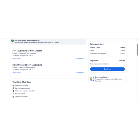 JetBlue and Expedia have round trip airfares travelling to and from Ft Lauderdale (FLL) and New Orleans (MSY) for $55, nonstop. These are basic economy fares that include a personal item and a carry-on bag. There is no seat selection and no change. If you are travelling with children on JetBlue, you will be seated together as per the airline's policy.