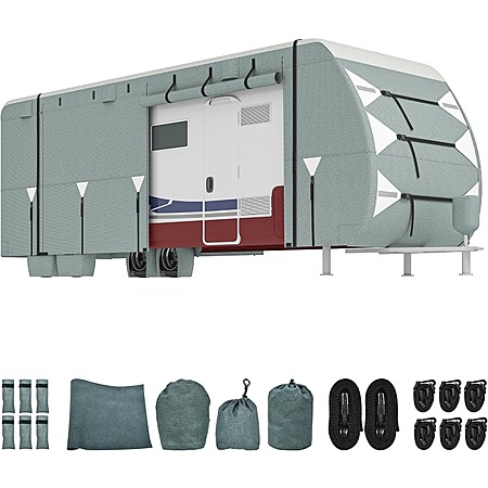 Complete Accessory Kit: Includes the cover (fits 24-27ft RVs), 4 tire covers, a tongue jack cover, 6 gutter covers, 2 repair patches, and a storage bag.