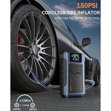 - 150PSI PORTABLE CORDLESS AIR TIRE PUMP - Not only a portable jump starter booster pack, but also an air compressor that with preset 4 inflation mode & auto shut-off function,support to fill a flat car/motocycle/bikecycle tire, balls and pool toys, allows PSI KAR BAR unit switch