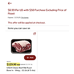 Beef Rib Roast Bone-in for $6.99 per LB with $50 purchase (excluding price of rib roast)