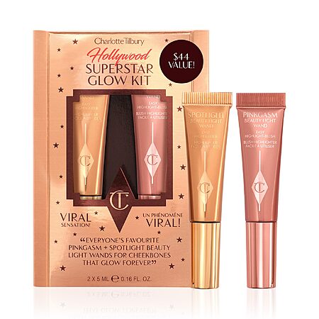 - HOLLYWOOD SUPERSTAR GLOW KIT. Features: Limited edition mini beauty light wand duo in award-winning, viral Spotlight + Pinkgasm Blush + Glow with Charlotte's Beauty Light Wand Duo for cheekbones that glow forever!. The foolproof, easy-lock cushion applicator + buildable, blendable formula allow you to dial up the dots and customise your glow!. Charlottes Beauty Light Wands are infused with cloudberry extract for antioxidant benefits and lindera root essence for skin that looks smoother and more radiant. Research Results: Clinically proven! Up to 12-hour long-lasting wear*! Charlotte's pro-grip technology grips skin and makeup for a glow that lasts!. Clinically proven hydration for up to 24 hours*. *Tested on 30 people. Formulated Without: Sulphate. Parabens. Formaldehydes. Formaldehyde-Releasing Agents. Phthalates. Retinyl Palmitate. Oxybenzone. Coal Tar. Hydroquinone. Sulphates SLS & SLES. Synthetic Fragrance (less than 1%). Triclocarban. Triclosan.