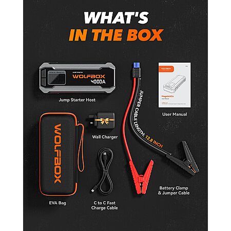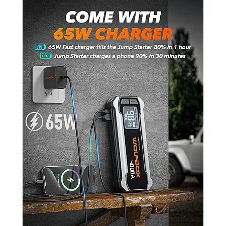 WOLFBOX MV24 4000A Jump Starter, 24000mAh, 12V with 65W Quick Charger, LED Display $69.99