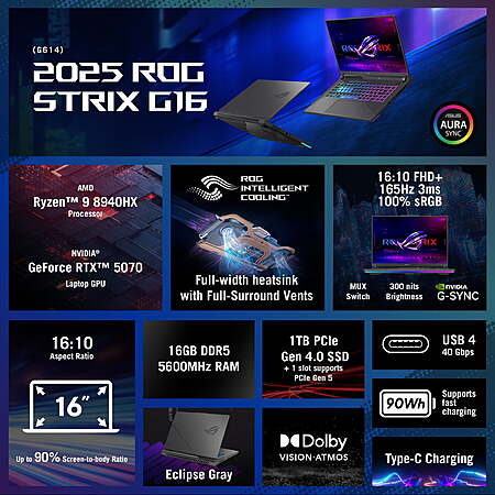 Unlock a next-level gaming experience with the ROG Strix G16. Featuring a 165Hz/3ms display, the ROG Strix delivers smooth visuals. Powered by an AMD Ryzen 9 8940HX Processor and NVIDIA GeForce RTX 5070 Laptop GPU, enjoy seamless gaming and creative performance. With 16GB LPDDR5 RAM and 1TB PCIe 4.0 SSD, multitask seamlessly while enjoying expansive storage. The advanced ROG Intelligent Cooling keeps the system cool, even under intense gaming marathons. The esports-ready keyboard, Dolby Atmos audio, and customizable RGB Aura Light Bar elevate every moment. Plus, enjoy easy upgrades and 3 months of PC Game Pass for the ultimate gaming experience. Cutting Edge Performance – Experience next-level performance with Windows 11 Home, an AMD Ryzen™ 9 8940HX Processor, and an NVIDIA® GeForce RTX™ 5070 Laptop GPU powered by the NVIDIA Blackwell architecture and featuring DLSS 4 and Max-Q technologies. High Performance Memory and Storage – Multitask seamlessly with 16GB of DDR5-5600MHz memory and store your game library on 1TB of PCIe Gen 4 SSD. Dynamic Display – Immerse yourself in stunning visuals with the smooth 165Hz/3ms FHD+ display for gamin and entertainment. Featuring a new ACR film that enhances contrast and reduces glare. State-of-the-art ROG Intelligent Cooling – ROG’s advanced thermals keep your system cool, quiet and comfortable. State of the art cooling equals best in class performance, featuring Tri-fan technology and an end-to-end vapor chamber delivers fast gameplay. Customizable RGB Lightbar – Showcase your style with a customizable RGB light bar that syncs with your keyboard and ROG peripherals. In professional settings, Stealth Mode turns off all lighting for a sleek, refined look. MUX Switch withe Advanced Optimus – A MUX Switch boosts gaming performance by 5-10% by routing frames directly from the dGPU. Advanced Optimus improves battery life by automatically switching between the iGPU and dGPU based on the task, without restarting. 3-Month PC Game Pass Included – Enjoy a free 3-month pass and access over 100 high-quality games. With new games added every month, there’s always something new to play.
