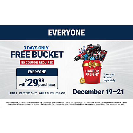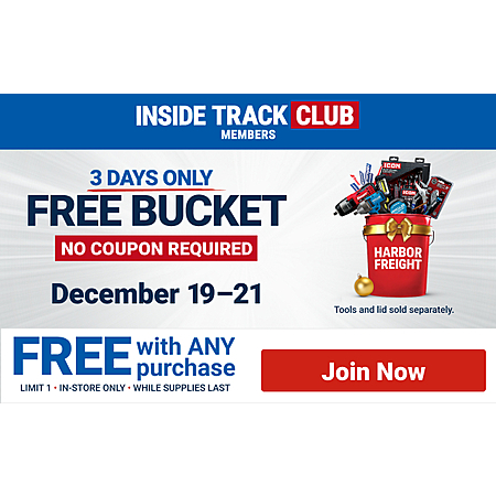 Harbor Freight offers ITC members a FREE BUCKET with ANY purchase, valid Dec 19-21.