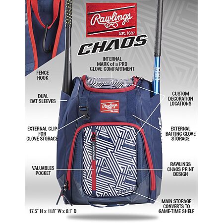 Rawlings CHAOS Baseball Backpack Bag (Red/White/Blue) $15.58 + Free Shipping w/ Prime or on $35+