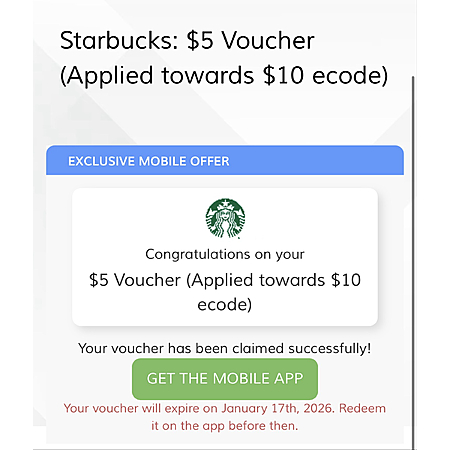 Click on CLAIM YOUR VOUCHER button to get your $5 voucher for Starbucks in your accountThe $5 voucher can be applied on the Mobile app towards a Starbucks e-code ($10 min)