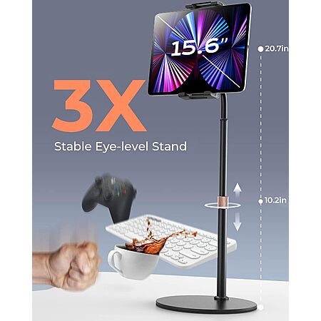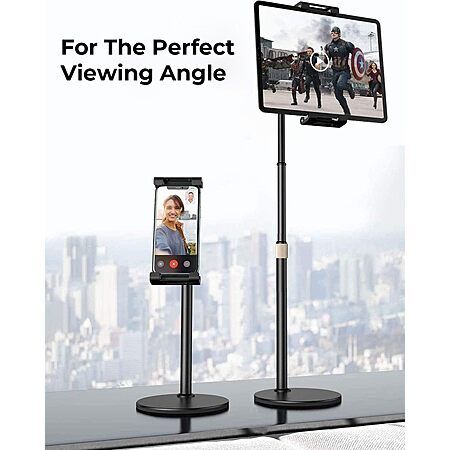 If you use a tablet or portable monitor a lot, consider this stand which will elevate it for more natural viewing angles and help prevent possible neck strain or pains. This is an ideal height to raise your devices on top of a fixed height desk. It is fully adjustable - Height, Angle, Rotate - do it all! You can fit your tablet with it's case, and your phone would work, too! Our family does a lot of family video calls and weekend Karaoke sessions with our iPads and this is perfect to hold it in line of sight, so we can all see the lyrics without looking downwards. This thing looks extremely stable, with a wide base.