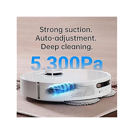 - Strong Vacuuming & Carpet Cleaning: 5,300 Pa suction, automatic carpet detection, and rubber brush work together to clean floors and carpets. Mop lifts or avoids carpets as needed.