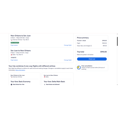 Delta Air Lines, American Airlines and Expedia have round trip airfares travelling to and from New Orleans (MSY) and San Juan Puerto Rico (SJU) for $195, making 1 stop. These basic economy fares allow a personal item and a carry-on bag. There is no seat selection and no change.