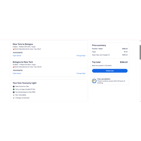 Swiss Air via Expedia have round trip airfares travelling from New York (JFK) to Bologna Italy (BLQ) for $387, making 1 stop. These are economy light fares, like basic economy where you're allowed a personal item that fits under the seat in front of you and a carry-on bag up to 18 lbs. There is no seat selection and no change.