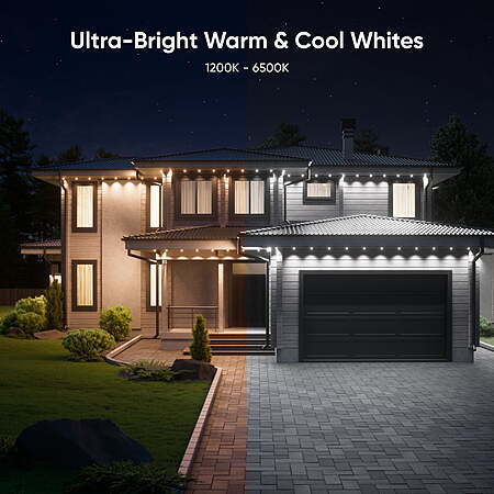 | Product Description: | Light up your outdoors year-round with Nanoleaf Smart Multicolor Permanent Outdoor Lights. These durable, low-profile LEDs stay discreet by day and shine with vibrant, customizable colors at night. Easily install along eaves or soffits to enhance style, ambiance, and safety. Mounting screws are included for a secure, long-lasting setup. Easy Smart Control: Control directly with the Nanoleaf App over Wi-Fi (or Bluetooth), and/or connect to a smart home ecosystem for voice control and more with a Matter compatible smart home hub. You can also use the attached in-line controller for easy access! 30 Addressable LED Pucks: Watch multiple colors appear at once along your lights for a stunning effect. Set colors to flow gradually or pop up energetically to match any mood! Dynamic Color-Changing Animations: Create and customize your own colorful lighting effects with over 16M+ colors. Transition colors slowly for the perfect ambience, or turn up the speed to get the party started. Cuttable & Extendable: Connect up to 147ft (45m) to one Controller, trim and splice as needed for the perfect fit around your house. Smarter Kit comes with multiple modular 16ft (5m) strings that connect together easily. Set Schedules: Automate your lights to turn on/off at set times and days to make your daily schedules easier and more convenient. Set Schedules through your smart home ecosystem or voice assistant – Matter compatible smart home hub required. Ultra Durable For Outdoor Use: These UV resistant IP67 & IP65 permanent outdoor lights are weatherproof and can withstand heavy rain, snow or UV rays. The anti-glare lens design also allows for smooth wall wash effects on your exteriors. Adheres to Most Common Surfaces: Install these smart permanent outdoor lights on concrete, metal, plastic, wood, fiber cement or vinyl. Screws are required for reinforcement and permanent mounting. Professional or DIY Installation: Professional installation is recommended, but we've made it easy for seasoned DIYers to install on their own as well. Use the provided tape, clips, and screws for setup! |