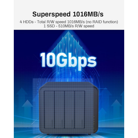 High-Speed Data Transmission: The D4-320 hard drive enclosure (a DAS, NOT a NAS) utilizes the USB 3.2 Gen2 protocol, achieving high-speed data transmission of up to 10Gbps. When equipped with four hard drives, the actual read/write speed can reach up to 1,016 MB/s (combined read/write with four SATA III HDDs of 8TB each). With just one SSD installed, the read speed effortlessly reaches 510 MB/s (SATA III 1TB SSD). The D4-320 supports a single HDD up to 30TB, with a total capacity of 120TB, and is compatible with various hard drives, including 3.5-inch SATA hard drives, 2.5-inch SATA hard drives, and 2.5-inch SATA SSDs.