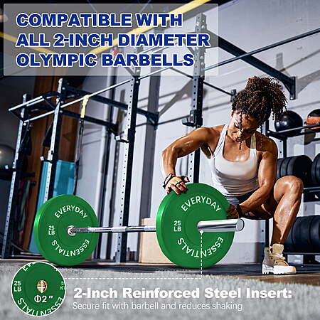 | Product Description: | BalanceFrom Olympic Bumper Plates - Sold in Pairs or Sets - Available in Black or Color Whether you're a seasoned lifter or just starting your fitness journey, our bumper plates are the perfect addition to your home or commercial gym. Crafted for durability, ease of use, and versatility, these plates offer a wide range of weight options to suit your fitness needs. Here's why they're your go-to choice: Sold as Pairs and Sets: Pairs Available in: 10, 15, 25, 35, 45, and 55 pounds Sets Offered: 160 Pounds Set: 2x10LB + 2x25LB + 2x45LB Plates 210 Pounds Set: 2x25LB + 2x35LB + 2x45LB Plates 260 Pounds Set: 2x10LB + 2x15LB + 2x25LB + 2x35LB + 2x45LB Plates 370 Pounds Set: 2x10LB + 2x15LB + 2x25LB + 2x35LB + 2x45LB + 2x55LB Plates Key Features at a Glance: 2" Inner Ring Diameter: Compatible with Olympic barbells. Total Diameter: 17.75": Ensures a secure fit on the bar and provides stability during lifts. High-Density Rubber Plates: Designed for durability, they can withstand the demands of intense workouts. Solid Stainless Steel Insert: Provides a secure and snug fit on the barbell, preventing shifting during exercises. Pairs or Sets: Choose individual pairs or opt for a complete set to kickstart or expand your weight collection. Our bumper plates offer consistent and reliable performance, perfect for powerlifting, Olympic lifting, and cross-training. Elevate your fitness routine with quality and versatility - choose our bumper plates for your next workout. BalanceFrom Olympic Bumper Plate Set with Steel Hub, Color Coded, 25 lbs Pair, 17x2 In 2" inner ring diameter for compatibility with Olympic barbells Total diameter of 17.75" ensures a secure fit on the bar and stability during lifts High-density rubber plates designed for durability, able to withstand intense workouts Sold as pairs, perfect for customizing your weight collection Solid stainless steel insert provides a secure and snug fit on the barbell, preventing shifting during exercises |