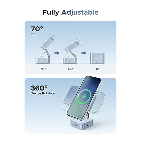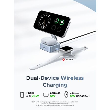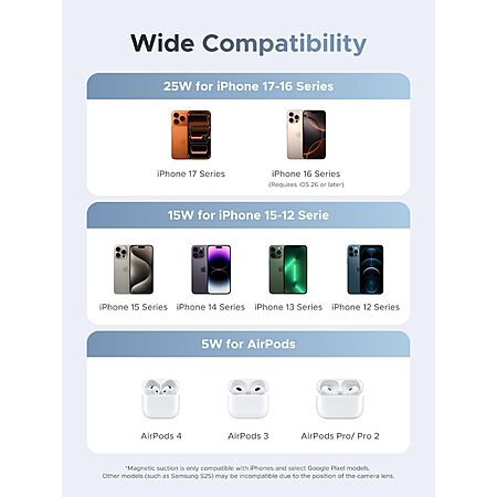 - Power Requirement: For full 25W charging, iPhone 17/16 with iOS 26 or later is required. Please use a 45W or higher charging adapter (not included). A 3ft USB-C to USB-C cable is included; if using another cable, ensure it supports 60W or higher