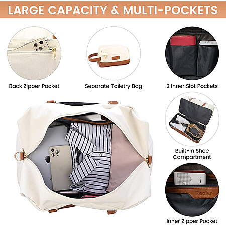 | Product Description: | Realer Weekender Bag for Women-Perfect size for Family Holiday, Weekend Trips, Overnight Stay, Business, Travel, Sport, Beach, Hiking and Camping, also a great hospital bag for mommy-to-be Our Travel Duffel Bag Highlights- Many styles meet for different occasion, include classic solid color style, cute polka dots style, flowers painting style Ultra high capacity with 2 small pocket and 1 zipper pocket, can put mobile phones, books, or some other small things in these small pocket, main compartment can hold your clothing, accessories, suitable for 2-4 days weekender or business trip Independent shoe compartment: large, flat separate compartment that may accommodates sneakers, heels...... Separated toiletries bag: can keep the toiletries separately and organize well all your essentials Luggage trolley sleeve and adjustable strap with pad to free your hands Tote bag size: 21"Lx13"Dx10"W, detachable shoulder length Max 52", Min 32". Shoe compartment size: 21"Lx4.5"Dx10"W, may fit up to 2 pair of shoes 3-in-1 Design: Includes a toiletry bag, adjustable and detachable sling strap, and an independent shoe compartment. Flight Friendly: Meets carry-on luggage regulations and fits in overhead compartments or under seats as personal items. Warm Design: Features an inner zip wallet pocket, 2 slot pockets, and a back sleeve for sliding over suitcase handles. Perfect for Various Uses: Ideal for family holidays, weekend trips, business travel, sports, beach, hiking, camping, and as a hospital bag for mommy-to-be. Ultra High Capacity: Main compartment can hold clothing and accessories for 2-4 days, with additional small pockets for mobile phones and books. |