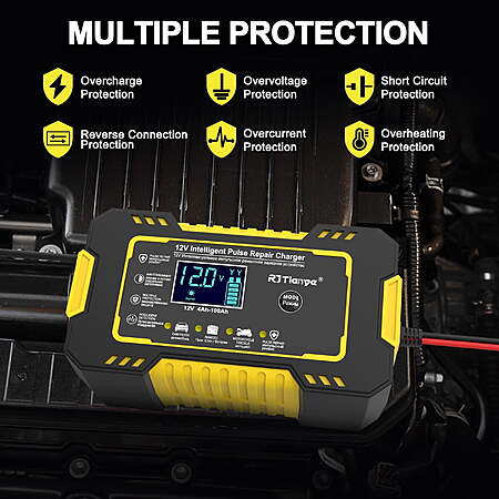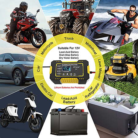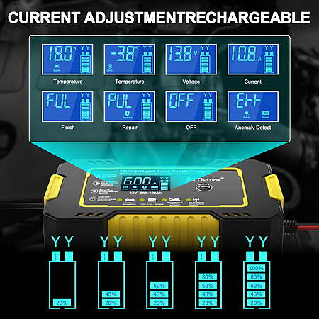 | Product Description: | ??Fully-Automatic Lead-Acid Battery Charger Automotive Battery Charger 6-Amp 12V Fully-Automatic Smart, It's smaller but delivers more power, battery maintainer, trickle charger, plus battery desulfator,with Temperature Compensation,Charge or repair all 12V lead-acid batteries,LiFePO4,Lead Acid (AGM/Gel/SLA..) deep-cycle batteries, including AGM, GEL, SLA, and Flooded in cars, trucks, SUVs, motorcycles, lawnmowers, boats, marine, etc. ??Scientific Battery Repair Model Built-in advanced battery REPAIR mode to help to recover old/idle batteries and extend battery life. Please use repair mode if the car battery charger cannot charge the battery. The high-frequency and low-frequency pulse technology has good repair and activation effects. Note: It can not activate a dead battery or repair a damaged battery. ??Easy Operation, Intelligent Memory Car battery charging mode has memory function. After charging, it defaults to the state mode used before the last power failure. There are no complicated steps, just plugging and charging. Note: Power connection is required, Input voltage :110-220V, 50-60Hz, output voltage/current :max 12 V5A. ??Quick Battery Charger 12 volt 6-Amp quick car battery charger, can charge or repair all 12-volt lead-acid automotive, marine and deep-cycle batteries including AGM, GEL, SLA, Flooded in cars, trucks, SUVs, motorcycles, lawn mowers, boats, etc. Perfect household tool and gift for Father's Day! ??Visualized Charging & Battery steward Using a backlit LCD, the battery charger automotive clearly and visibly shows an LCD screen displaying the charging status and battery status; An integrated thermal sensor detects the ambient temperature and alters the charge to eliminate over-charging in hot climates and under-charging in cold climates. Specifications: Size: 5.91" (W) x 3.35" (D) x 2.36" (H) Material:ABS+PC Input line length: 90cm Input Voltage: AC 110-220V,50-60Hz Application:12V 2Ah-100Ah Net Weight: 400g Package Content: 1 x Lead-Acid Battery 1 x Operation Instruction Note: Mainly used for LEAD-ACID BATTERIES (lithium batteries prohibit) The size of the product is slightly wrong by manual measurement.The appearance color of the product shall prevail. 【High-Efficiency Pulse Repair】Battery charger automotive detects battery sulfation and acid stratification, take newest pulse repair function to restore lost battery performance for stronger engine starts and extended battery life. NOTE: Can not activate or charging totally dead batteries. 【8 Kind Of Charging Protection】The charging cable contains heat-resistant and oxidation-resistant copper wire, which is not easy to break. It has protection circuits such as overcharge/overvoltage/overcurrent/short course, with functions such as overcurrent protection, short circuit protection, reverse connection protection, overheat protection, overvoltage protection, and Undervoltage protection. 【Float/Trickle Charge】 Switch to float/trickle charge mode to maintain batteries over the winter: 1, Choosing corresponding modes(STD/AGM,GEL/WET/MOTORCYCLE) to fully charge the battery, screen display "FUL" 2, Then switch to "MOTORCYCLE" mode will auto-enter trickle charging mode to keep batteries stay charged for a long time. 【Temperature Detection & Multiple Protection】With built-in temperature sensor, it can be charged normally from -10°C (14°F) to 40°C (10°F). Built-in multiple detection, temperature protection, low voltage protection, overvoltage protection, short circuit protection, overcurrent protection, electrostatic spark protection. Allows you to recharge with complete peace of mind. 【Widely Compatible】 Perfect suitable for cars, golf cars, motorcycles, scooters, lawn mowers, ATVs, UTVs, tractors, trucks, SUVs, RVs, boats, PWCs, jet skis, snowmobiles, classic cars, children's toys and more. automatically switches to float, maintenance voltage after fully charging the battery. |