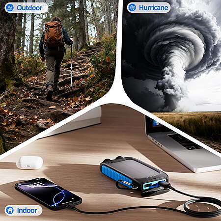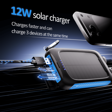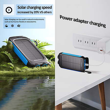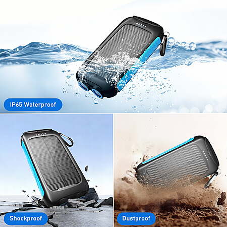 | Product Description: | SOLPOWBEN solar charger/solar power bank is designed for outdoor enthusiasts. We designed it to be compact (pocket-sized), lightweight (0.56 pounds), and durable (waterproof, dustproof, and shockproof). This solar usb charger has a capacity of 38800mAh and is equipped with high-quality ion polymer batteries, which can charge multiple devices simultaneously and life cycle > 1000 times. Not only can it be charged via a power adapter, it also comes with a solar panel (with a 24% CVR), allowing people to use sunlight to charge the portable charger. Our battery pack is equipped with an ultra-bright LED flashlight with three strong lighting modes: steady, strobe, and SOS, and a lighting range of up to 40 meters. The solar charger power bank is also equipped with a compass to help you find the right direction if you get lost. SOLPOWBEN solar phone charger is your ideal companion for outdoor sports 【38800mAh High Capacity】This eco-friendly solar charger power bank features a built-in 38800mAh high-capacity battery, capable of charging an iPhone 17 up to 7-8 times and an iPhone 17 Pro Max up to 5-6 times. Never worry about power outages caused by natural disasters like hurricanes or floods—a family-friendly choice. 【Super Battery Cell】Newly upgraded portable power bank with 12W fast charging. Features two USB ports and one Type-C output, with Type-C input (for charging the power bank). Capable of full-speed charging for one device while simultaneously charging up to three devices. Includes over-temperature protection and over-current protection. 【Wide Compatibility】Our solar phone bank is widely compatible with all Android series phones, iOS series phones, and iPads, such as: iPhone 17/16/15/14/13/12 Pro/Pro Max series, Galaxy S23/S23+/S23 Ultra/Flip5/Fold5, Galaxy A14, A54, Google Pixel, Motorola Moto G series, etc. 【Dual Charging Methods】The solar power bank features two charging options: Type-C charging and solar charging. Type-C serves as the primary daily charging method. Solar charging is designed for outdoor emergencies—simply attach the solar power bank to your backpack to store ample power anytime, anywhere. 【Multi-Function】The solar charger for cell phone features a high-brightness flashlight with three modes: steady on, slow flash, and SOS, making it an excellent nighttime lighting companion. The SOS mode allows you to signal for help in emergencies. The back of the solar charger also includes a compass to help you navigate Solar Charger panels(conversion rate of 24%) absorb light energy into electricity 5V/2.4A USB Output allow you to fast charge two devices simultaneously Solar power bank is equipped with two flashlights (0.36w), three modes of steady, SOS and strobe, you can use it in different situations. As an emergency lighting in darkness, the flashing light mode can be used as SOS Portable iphone charger compatible with all types of IOS and Android phone on the market, PDA, camera, MP3, MP4. Perfect backup battery for long-distance travel ships, field operations, camping, hiking, power blackout. Iphone power bank is waterproof(IP 65), shockproof and dustproof Using high-quality imported environmentally friendly Li-ion batteries, stable performance. Life Cycle > 1000 Times. USB portable charger with carabiner, portable on the backpack. Due to different weather and sunlight intensity, solar charging efficiency is lower than power adapter charging. Recommend using solar charging as an outdoor emergency energy solution. Due to the different battery capacity of your mobile phone, iphone, ipad or other devices, the number of charging times will be different |