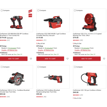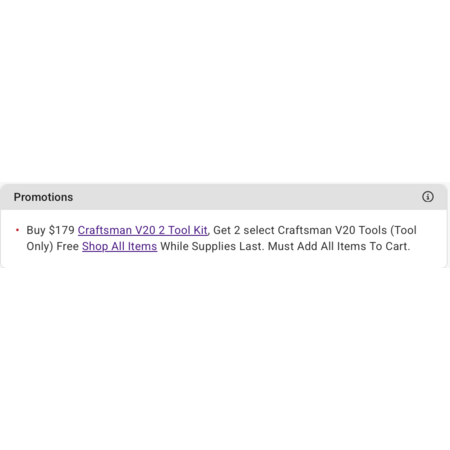Buy $179 Craftsman V20 2 Tool Kit, Get 2 select Craftsman V20 Tools (Tool Only) Free Shop All Items While Supplies Last. Must Add All Items To Cart.