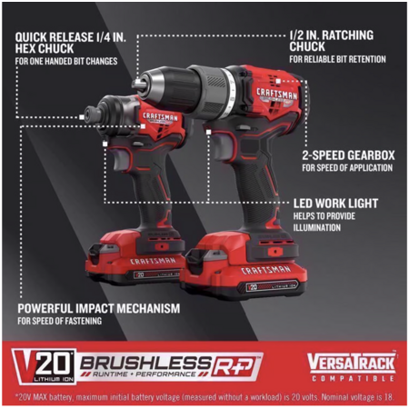 2. Craftsman V20 BRUSHLESS RP Cordless Brushless 2 Tool Combo Kit on sale for 179.99 ($219.00 original price)