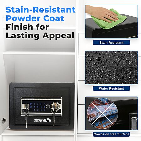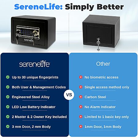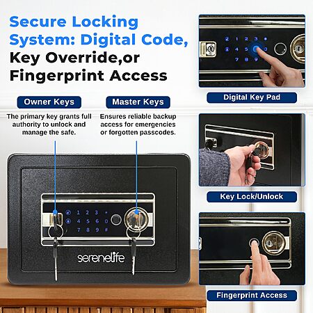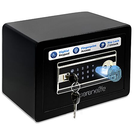 Amazon.com has SereneLife Fingerprint Safe 0.63 Cubic FT | Electronic Fingerprint Access, Money, Handgun & Jewlery Safe for Home & Office | Touchscreen Keypad & includes 4 Keys | 13.77 x 9.84 x 9.84 Inch | Black on sale for $39.86.