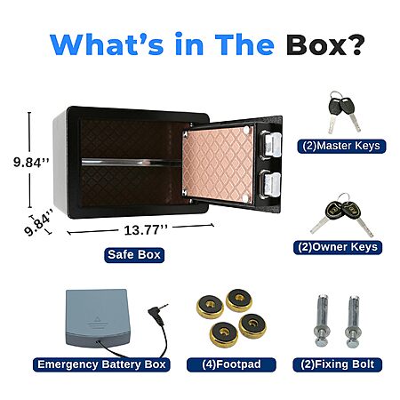- FULLY ASSEMBLED - The electronic safe box comes fully assembled with all necessary components: an emergency battery box, footpad, fixing bolt, 4 AA batteries, 2 owner keys, and 2 master keys. Perfect for secure storage in home, office, or business