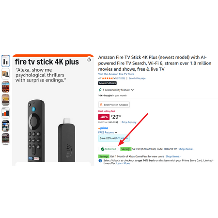 Amazon.com has Amazon Fire TV Stick 4K Plus (newest model) with AI-powered Fire TV Search, Wi-Fi 6, stream over 1.8 million movies and shows, free & live TV on sale for $21.99 after you click the "Redeem" button next to the coupon code (see screenshot) on the product page.