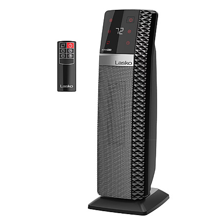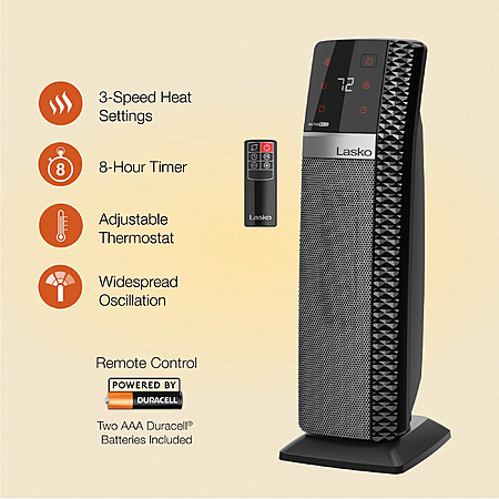 This Ceramic Tower Heater from Lasko's Elite Collection features simple digital controls with enhanced touch sensing capability, which makes operating your space heater easier than ever. With modern design details, this portable heater is ideal for living rooms, bedrooms, and other home spaces that need additional warmth. This heater quickly makes your rooms cozier and more comfortable with 25% wider oscillation and 1500 watts of heating power. Includes 3 heat settings, the Auto-Eco programmable thermostat, 8-hour auto shut-off timer, and an auto-dimming digital read-out. Built-in safety features include tip-over switch, overheat protection, and cool-touch housing. Includes a multi-function remote control, on-board remote storage, and built-in carry handle for portability. Comes fully assembled. 3-year limited warranty. Condition: New