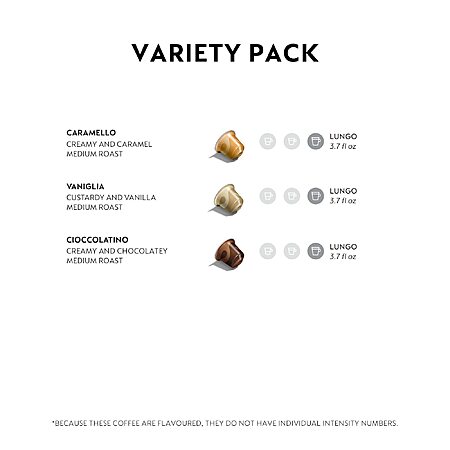 INDULGENT FLAVORS: This assortment of Nespresso Vertuo coffee pods contains a variety of Nespresso capsules: 10 Caramello, 10 Cioccolato, 10 Vaniglia.