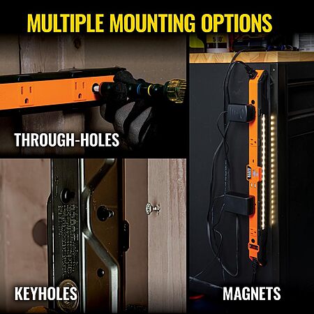 • Power strip with down-angled LED work light to illuminate job boxes and workspaces, allowing you to easily and safely complete tasks both on the job and at home.