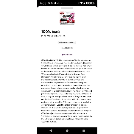 100% back in points on all batteries.Expires 12/27/25Valid when shopping In store onlyDisclaimer: Valid on purchases of batteries made in Staples® U.S. stores only. Not valid on Instacart, DoorDash or Uber Eats orders. Limit $40 in points earned. Points will be earned on the amount paid at checkout (rounded down to the nearest dollar), excluding taxes and shipping fees. While supplies last. Offer available to Staples Easy Rewards™ members only. To be eligible for the offer, member must activate offer in their Easy Rewards dashboard on staples.com or Staples mobile app and provide membership number at checkout. Points will be earned on the purchase amount paid at checkout after application of all promotions, coupons, instant savings and point redemptions. Taxes and shipping are not included in calculating the total purchase amount. May be used once per Staples Easy Rewards member within the promotional period, nontransferable. Offer may not be combined with any other Staples Easy Rewards promotion in a single transaction. Not valid on prior purchases or purchases made with Staples Advantage In-Store Purchase Program. Offer is subject to change or cancellation at any time. Staples Easy Rewards program terms and conditions apply. For full program details visit staples.com/easy. Expires 12/27/25. 426729..