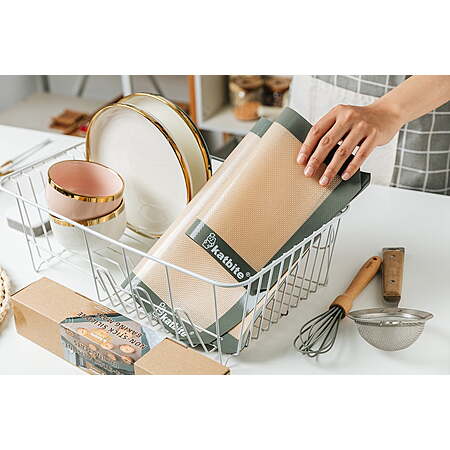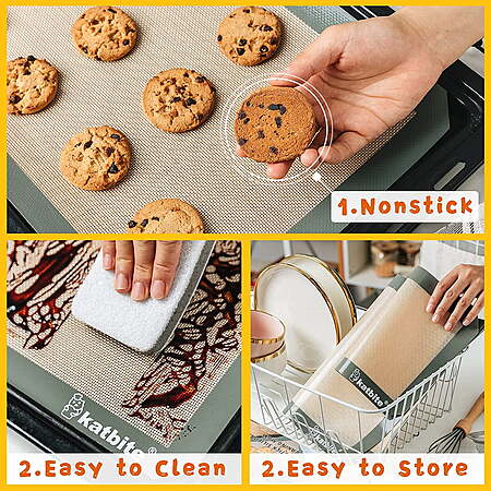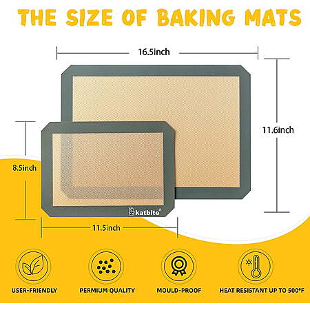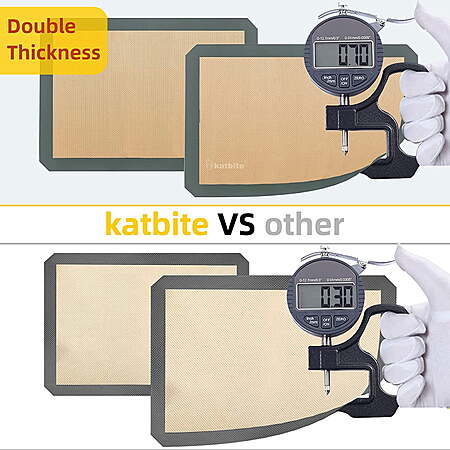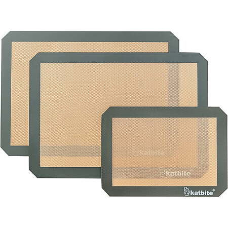 | Product Description: | Katbite Silicone baking sheet mats. It is 3 packs Silicone Baking Mats, 2 pack of half-sheet size mats (11.6 in x 16.5 in) & 1 pack of quarter-sheet size cooking mats (8.5 in x 11.5 in). Can directly onto any jelly roll pan or cookie sheet and place into the oven, up to 500 degrees Fahrenheit Let the food heat evenly, without uneven browning, no residual odor.withstands temperatures from -40�F to 500�F?-40? to 260?). Bakeware mat is safe for use in the oven, microwave and dishwasher with practicality and durability. MULTI-PURPOSE SET?3 packs Silicone Baking Mats, 2 pack size mats (11.6" x 16.5") & 1 pack size cooking mats (8.5" x 11.5"). Let the food heat evenly, without uneven browning, no residual odor. WACKER FOOD GRADE SILICONE: Katbite baking mats are made of WACKER silicone and premium fiberglass,which is BPA free, non-toxic, odorless. The silicone baking mats never tarnish or fade and will serve you meticulously for years, a must-have kitchen accessory. DOUBLE THICKNESS: Thickness of silicone baking mats is 0.7 mm(approx. 1/32"), which is almost twice that of others mats (0.3 mm). Thicker mats will not slip or wrinkle when used, extra thick and durable. NON-STICK & EASY TO CLEAN: This silicone cookie mat is non-stick and can be easily washed with warm soapy water or in a dishwasher, even if grease or dough sticks to the surface, resistant to stain and stick. PREMIUM QUALITY & RELIABLE: Silicone baking sheet mats withstands temperatures from -40�F to 500�F?-40? to 260?). Bakeware mat is safe for use in the oven, microwave and dishwasher with practicality and durability. |