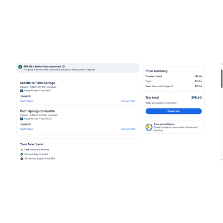 Alaska/Hawaiian Airlines have round trip airfares travelling to and from Seattle (SEA) and Palm Springs CA (PSP) for $99 nonstop. These are basic economy fares that allow a personal item and a carry-on bag. There is no seat selection and no change. If you are travelling with children, you will be seated together as per Alaska's policy.