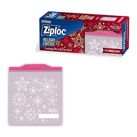 Model: Ziploc Quart Food Storage Bags, Grip 'n Seal Technology for Easier Grip, Open, and Close, 24 Count, Holiday Designs, Packaging May Vary