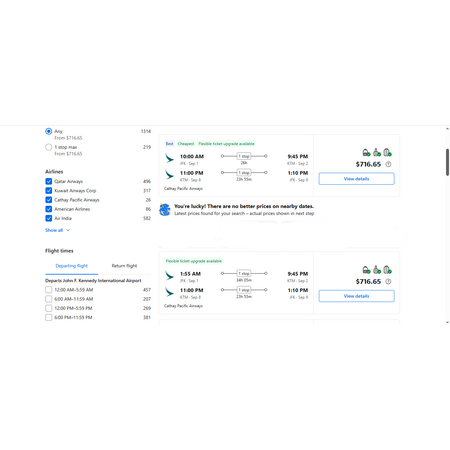 Cathay Pacific via Booking.com have round trip airfares travelling from New York (JFK) to Kathmandu Nepal (KTM) for $717, making 1 stop in Hong Kong both ways for several hours. These are economy fares that allow a personal item, a carry-on bag and 1 free checked bag.