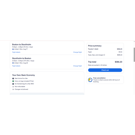 United Airlines, its code-sharing partners like Swiss, Lufthansa and Expedia have round trip airfares travelling from Boston (BOS) to Stockholm Sweden (ARN) for $387, making 1 stop both ways. Stopover duration and city depends on the flight you choose. These are basic economy fares that allow a personal item and a carry-on bag. There is no seat selection and no change. If you are travelling with children, you will be seated together as per United's policy.